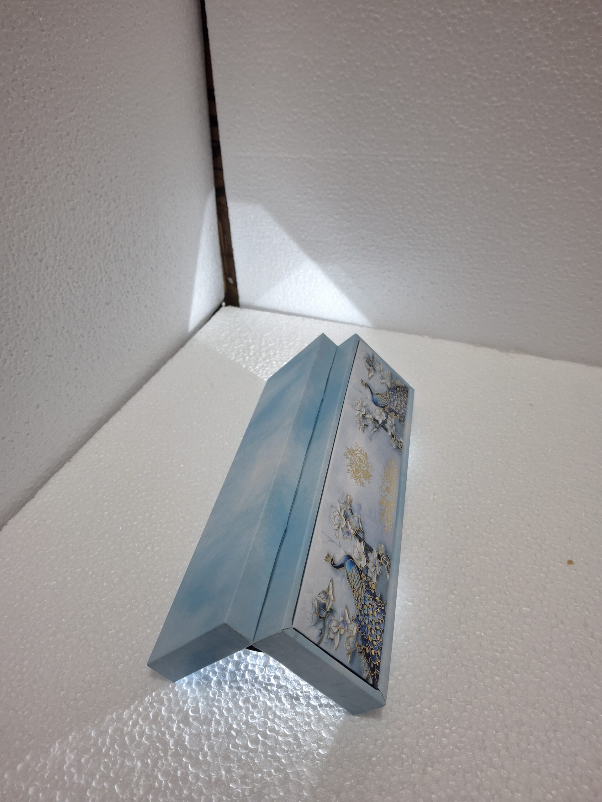 This elegant chain jewelry box isn’t just about storage—it’s about presentation, beauty, and experience. The soothing deep sky blue tones paired with golden accents create a mesmerizing sky blue combination that reflects luxury and charm. The built-in LED lighting, premium materials, and royal peacock motif make it more than just a box chain design—it’s a keepsake worthy of your finest jewelry.