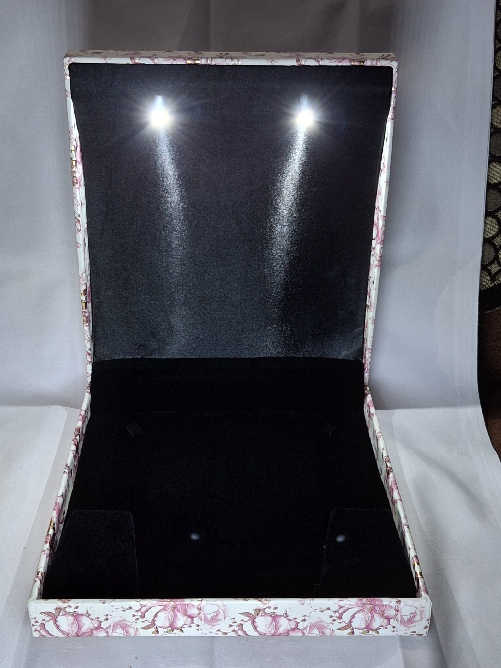 Inside, the plush black fabric lining offers a soft, protective cushion that prevents scratches or tangles. The sturdy plastic build ensures long-lasting protection from dust and moisture, keeping your necklaces safe. The built-in LED feature lights up as soon as the lid opens, creating a dramatic reveal that highlights the shine of your jewellery.