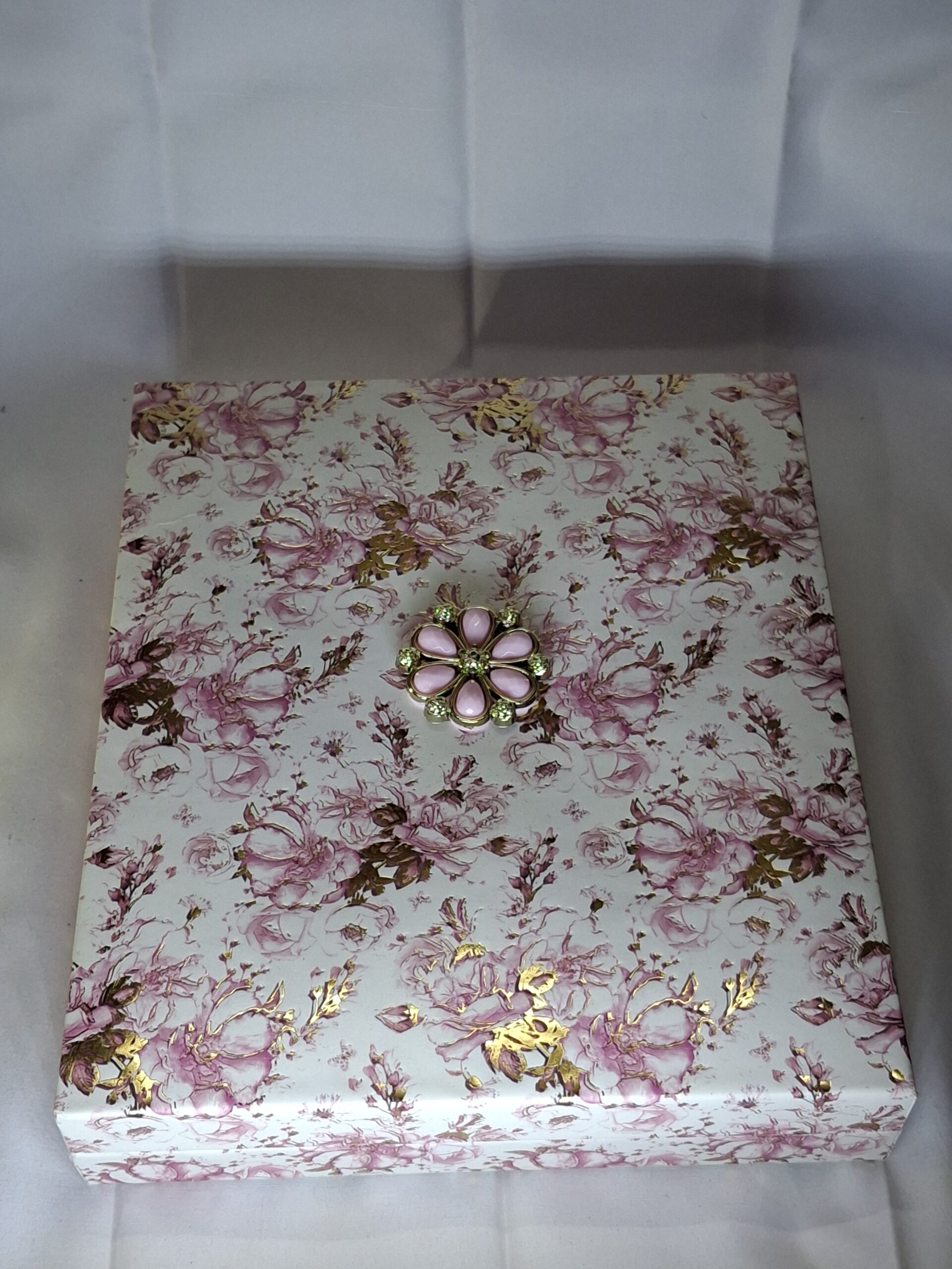 The exterior showcases a stunning pastel pink finish wrapped in floral-patterned pasting paper with soft golden detailing. The flower motif on the lid adds an elegant focal point, turning this pandora’s box necklace design into a symbol of beauty and grace. Inspired by blooming gardens and timeless romance, the custom necklace box style complements both traditional and modern jewellery, enhancing the overall appeal of your collection.