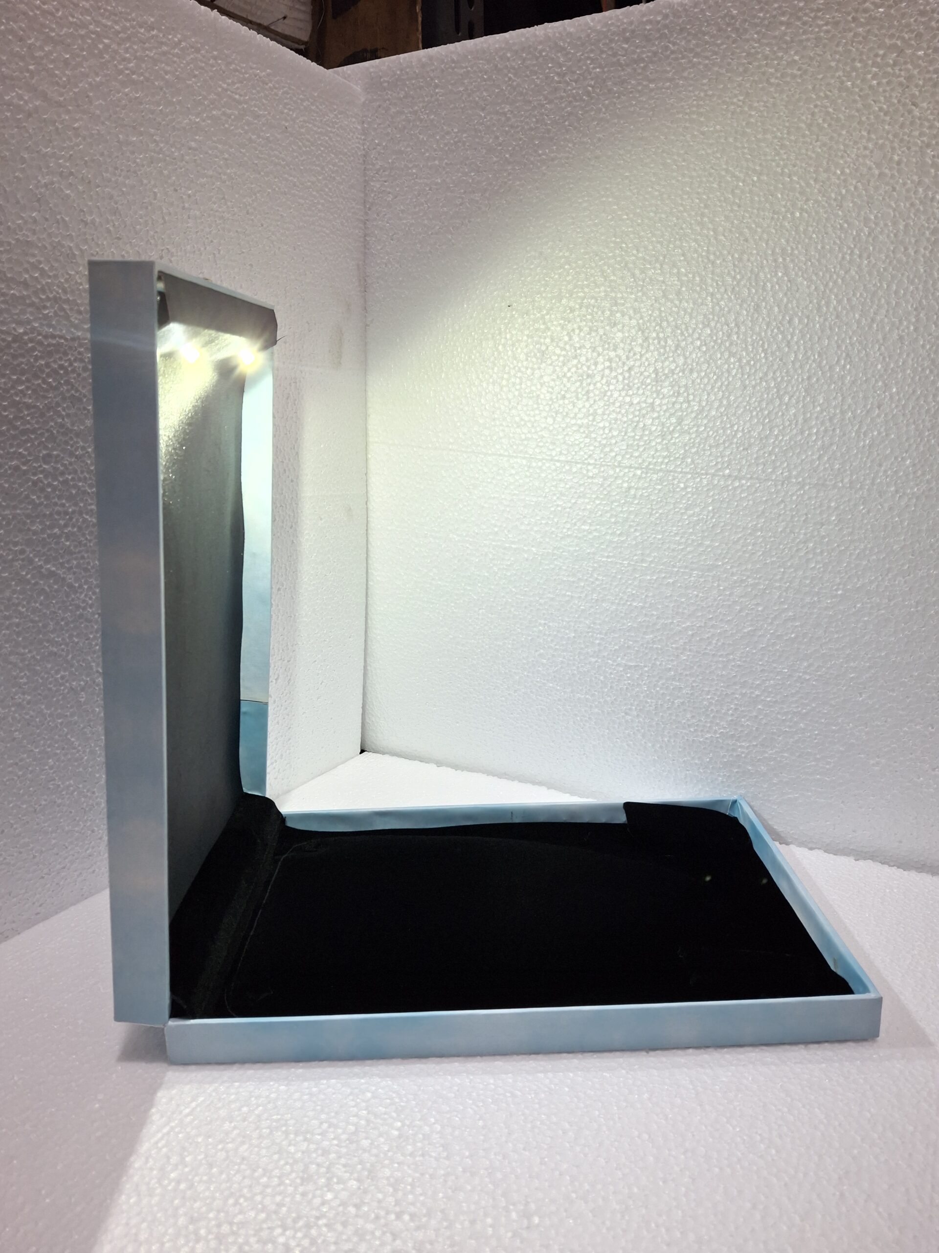 To complete the experience, the box includes a built-in LED light that activates as the lid opens. The gentle illumination highlights every sparkle and detail of your jewelry, ensuring it shines beautifully during presentations or photography. This light-up feature makes the box an exceptional choice for retailers looking for innovative jewellery box decoration ideas or for anyone who wants to make their jewelry presentation truly special.