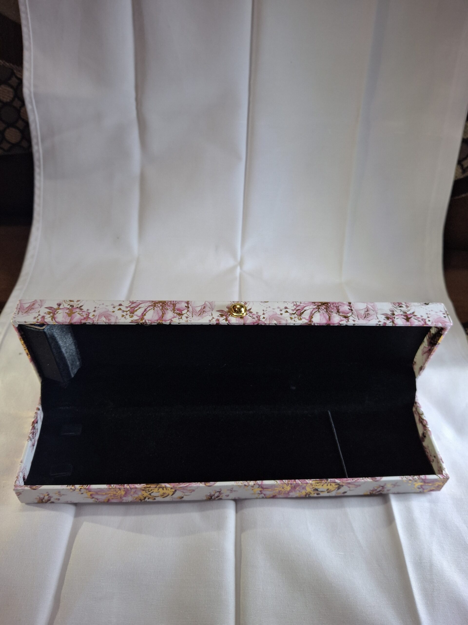 The outer surface comes in a soft pink tone with a beautifully pasted flower design, adding a feminine and modern touch. The floral detailing gives this box a premium finish, ideal for romantic occasions, anniversary gifts, or store displays. This jewellery box for necklace set design not only highlights your jewellery but also reflects fine craftsmanship and style that fits any décor.